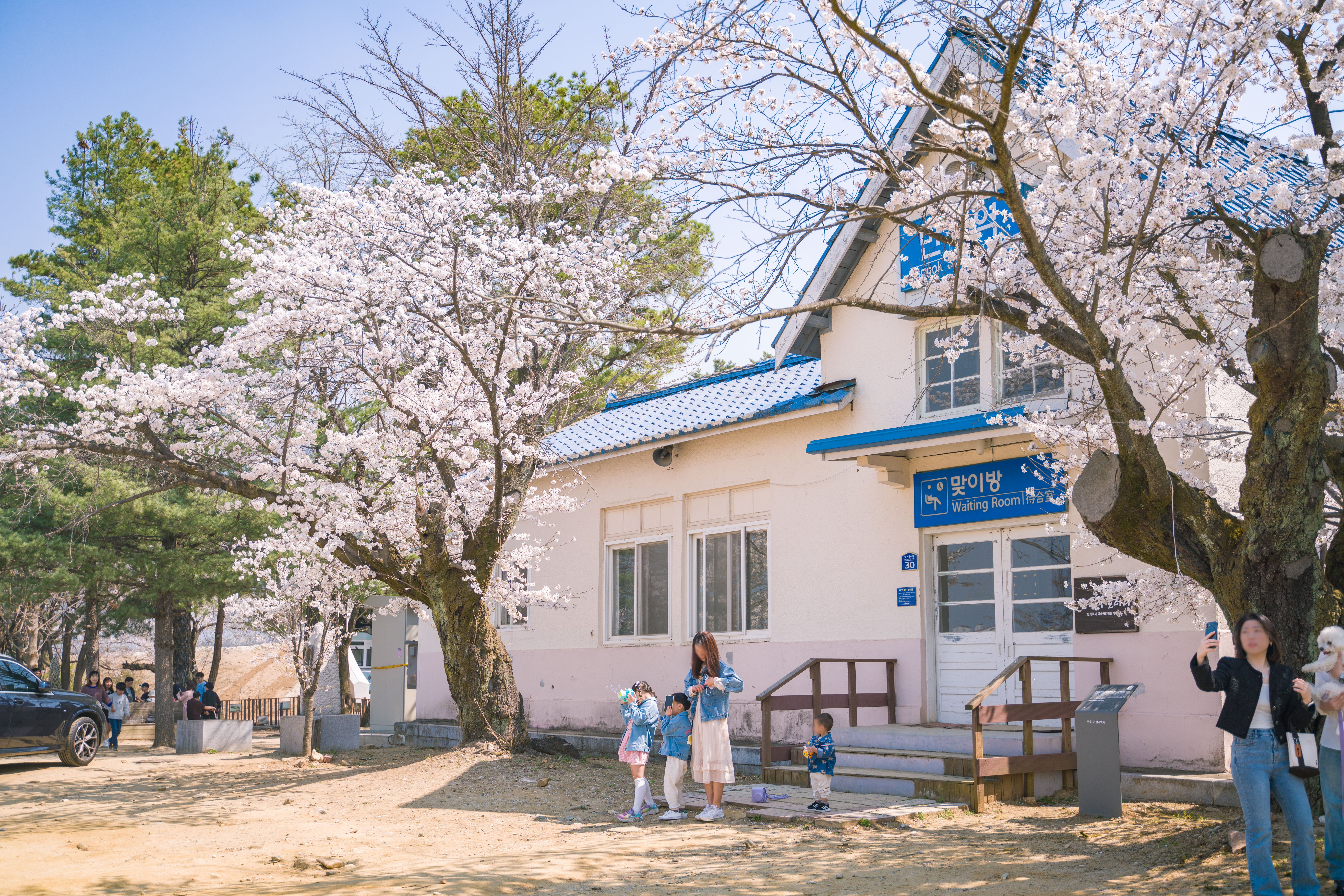 파란색 간판의 반곡역과 옛스런 느낌의 역사 건물 양쪽으로 큰 벚꽃나무의 조합이 정말.. 너무 이쁩니다.