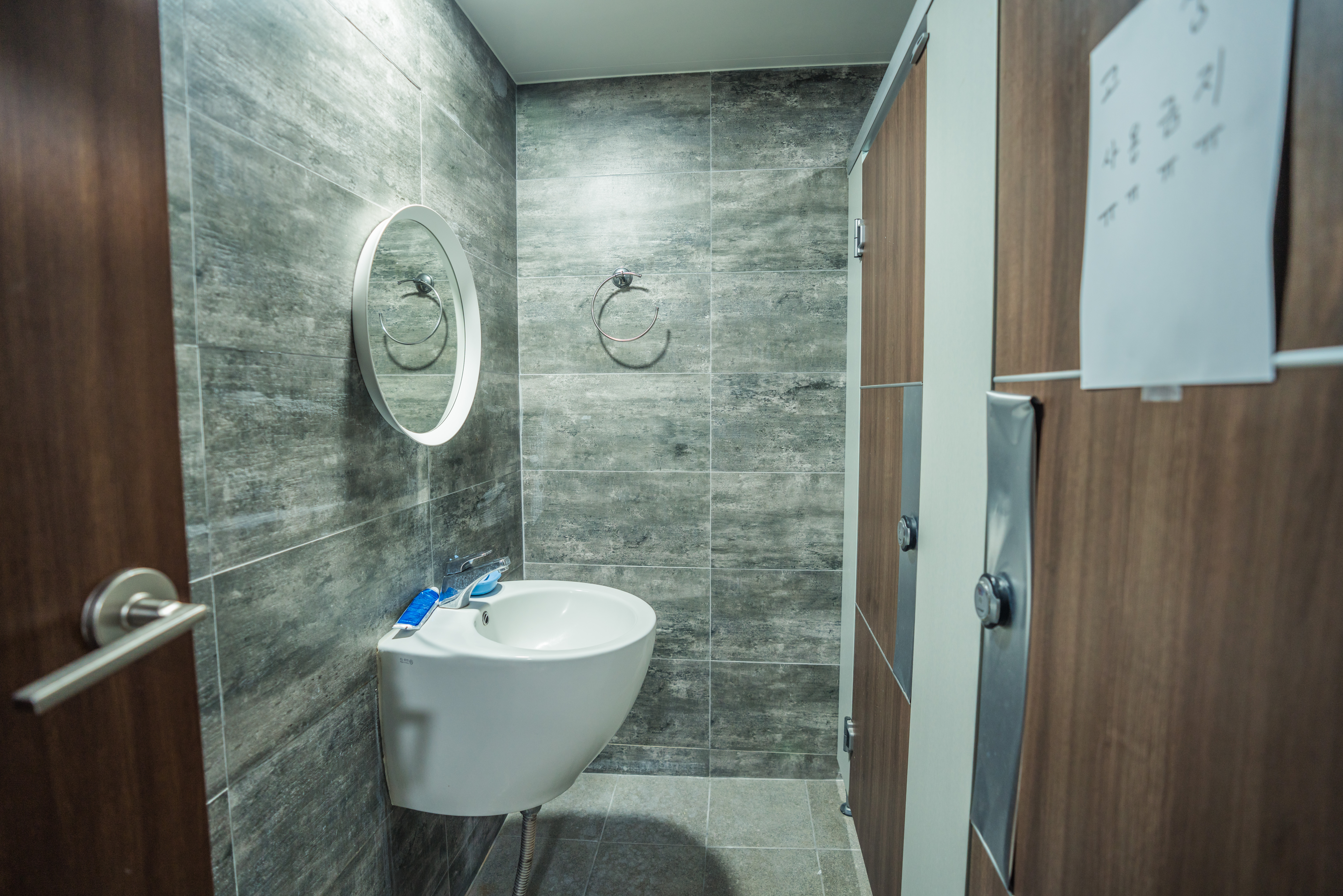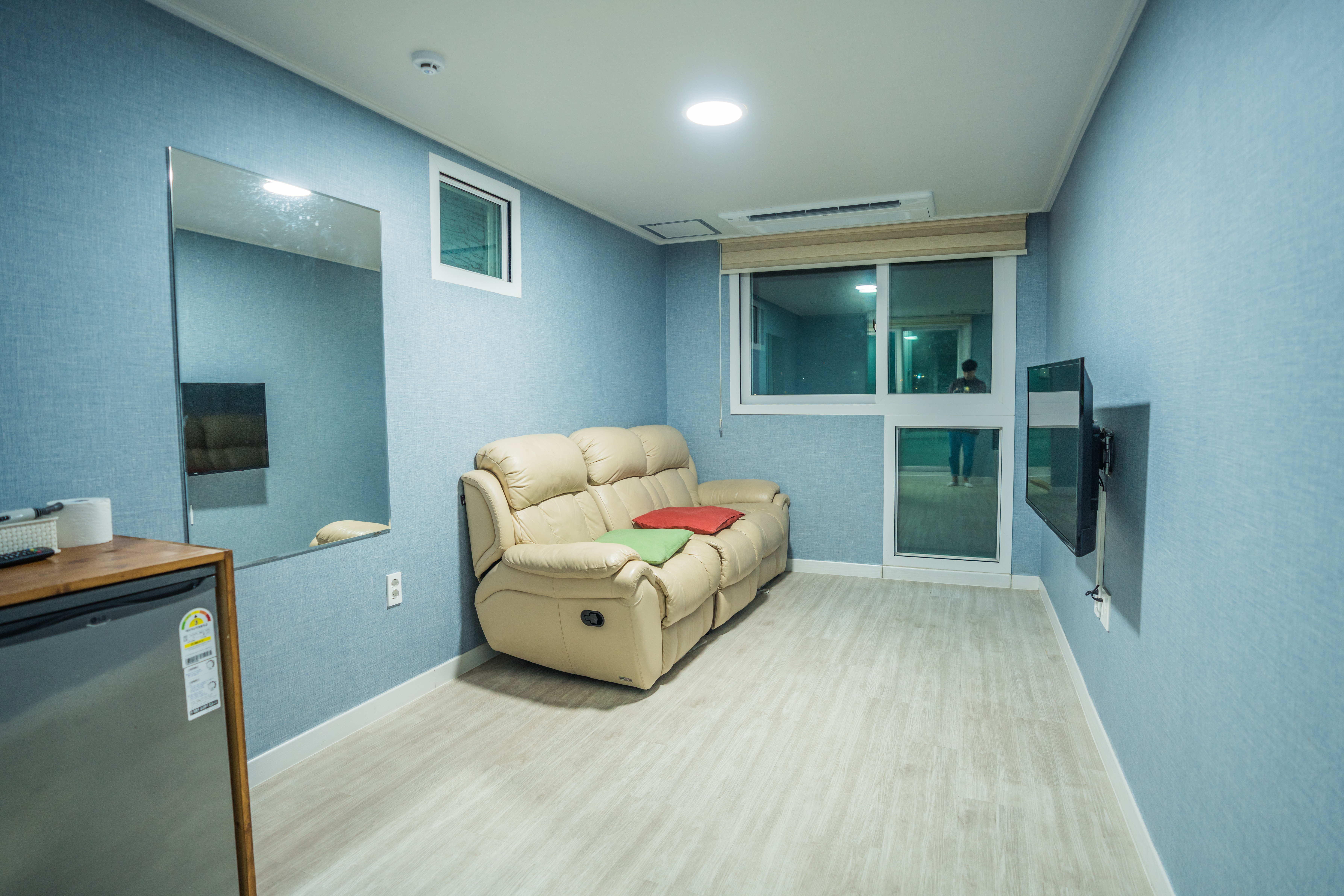 여긴 공용 구역 거실입니다. 쇼파가 있고 티비가 있어요. 거울 왼편으로는 작은 냉장고와 화장지와 헤어드라이기가 있습니다.