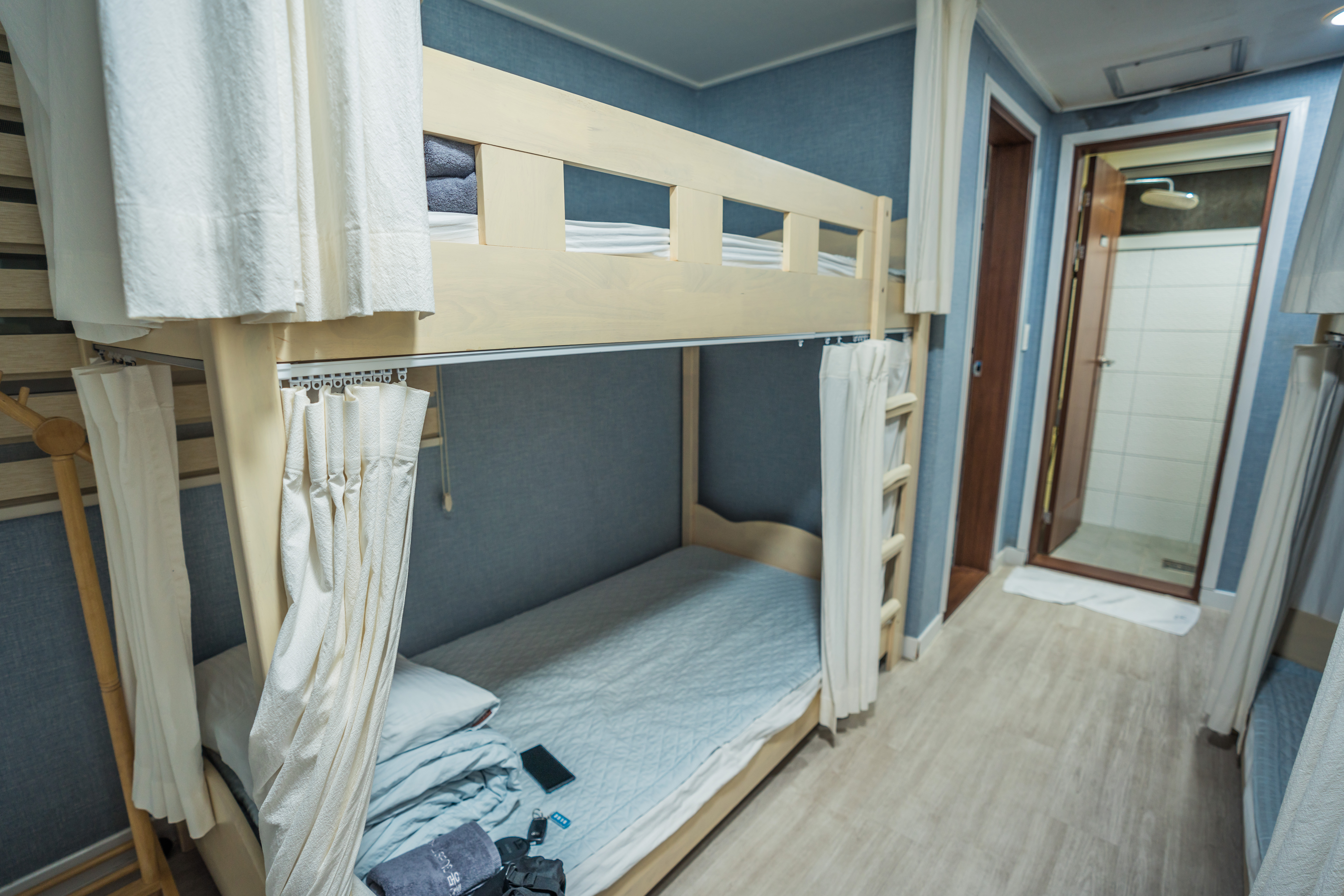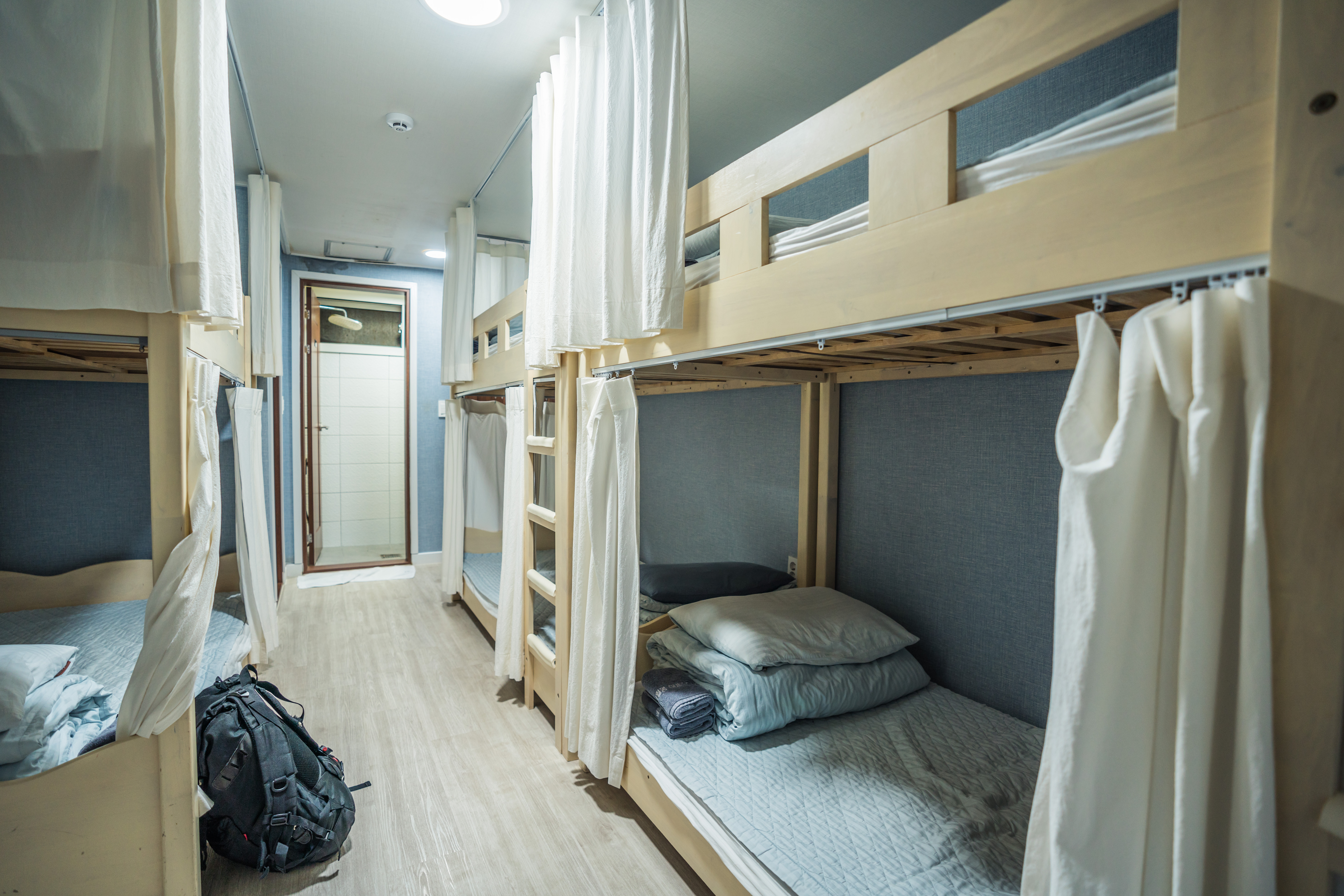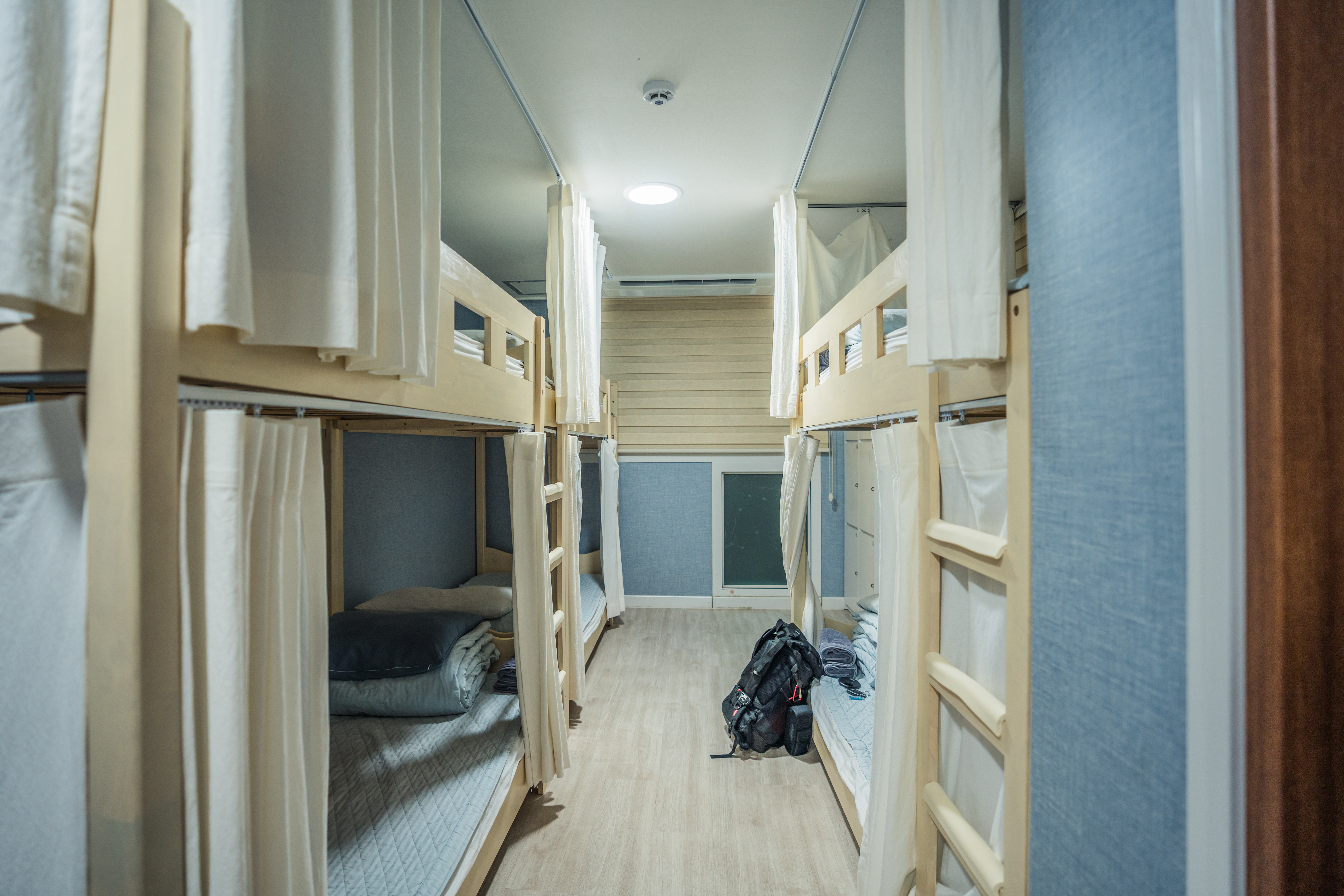 2층 침대가 방 양쪽으로 자리잡고 있어요. 2층 침대가 3개 6인실 입니다. 이 날 손님이 없어서 저 혼자 잤어요 완전 꿀