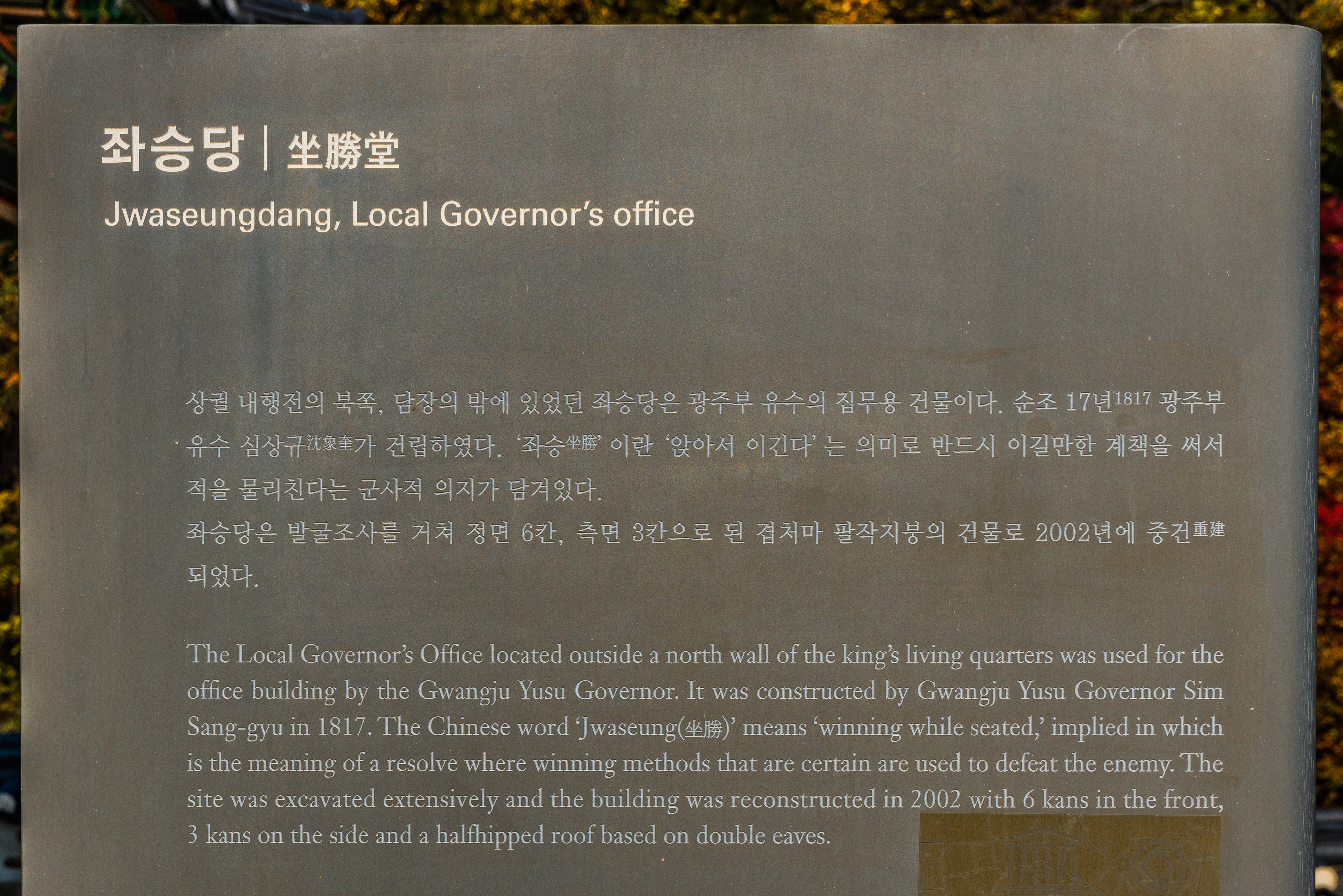 상궐 내행전의 북쪽, 담장의 밖에 있었던 좌승당은 광주부 유수의 집무용 건물로 순조 17년 광주부 유수 심상규가 건립하였다. 뜰로 나서면 좌우 문이 있는데 왼쪽문은 좌숙문이라 하여 북쪽 담밖으로 나무다리를 놓아서 통했다. 오른쪽 문은 의정문이라 하여 하궐 뒤로 통했다. 좌승이란 ‘앉아서도 싸우지 않고 이길 수 있다’는 의미를 지니고 있다. 발굴 조사 결과 건물의 기초부분이 잘 남아 있음이 확인되었고 정면 6칸, 측면 3칸으로 된 겹처마 팔작지붕으로 복원이 완료된 상태이다.