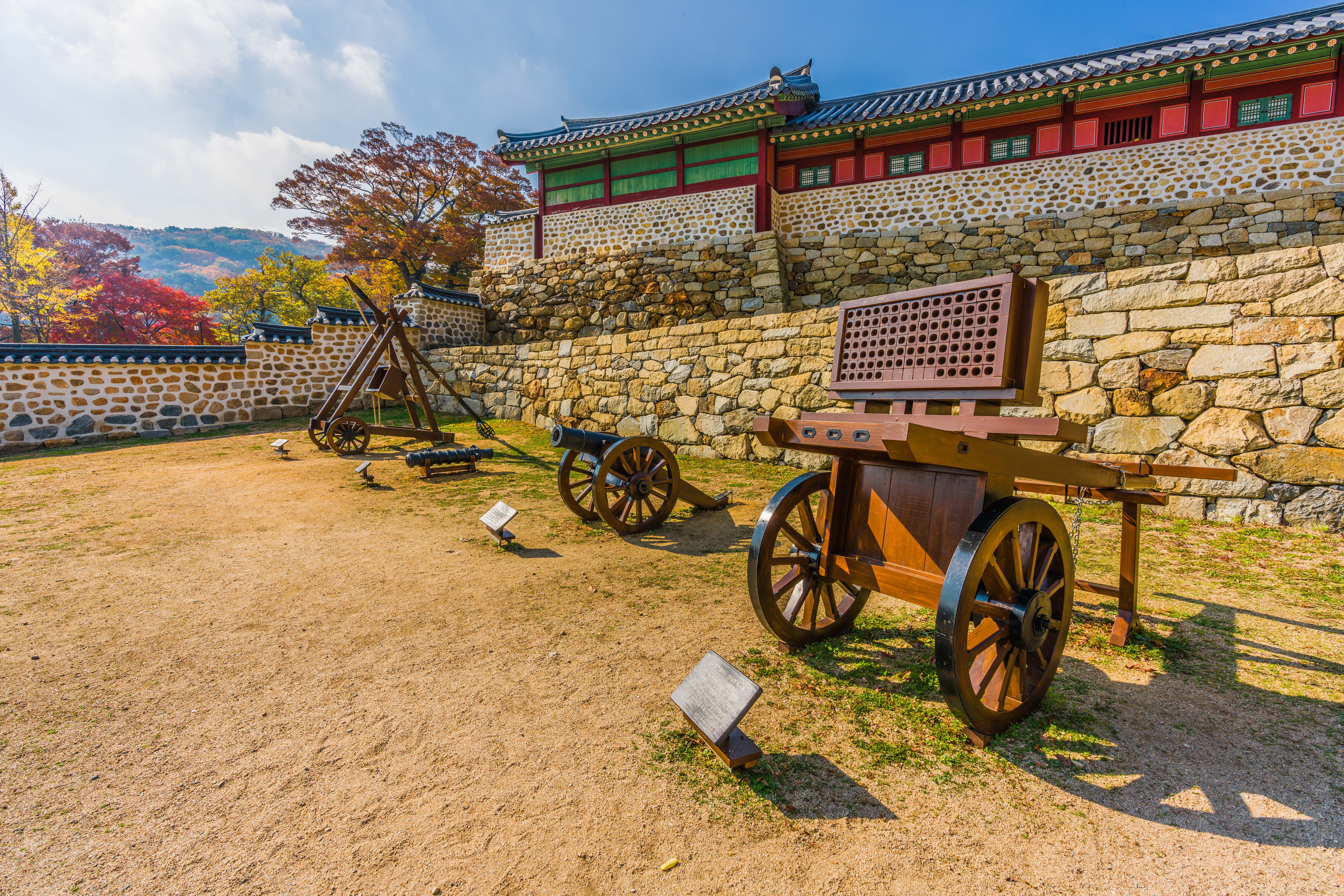 오른쪽에서 왼쪽으로 신기전기화차, 중포, 대장군포, 공성병기인 투석기가 전시되어 있었습니다.