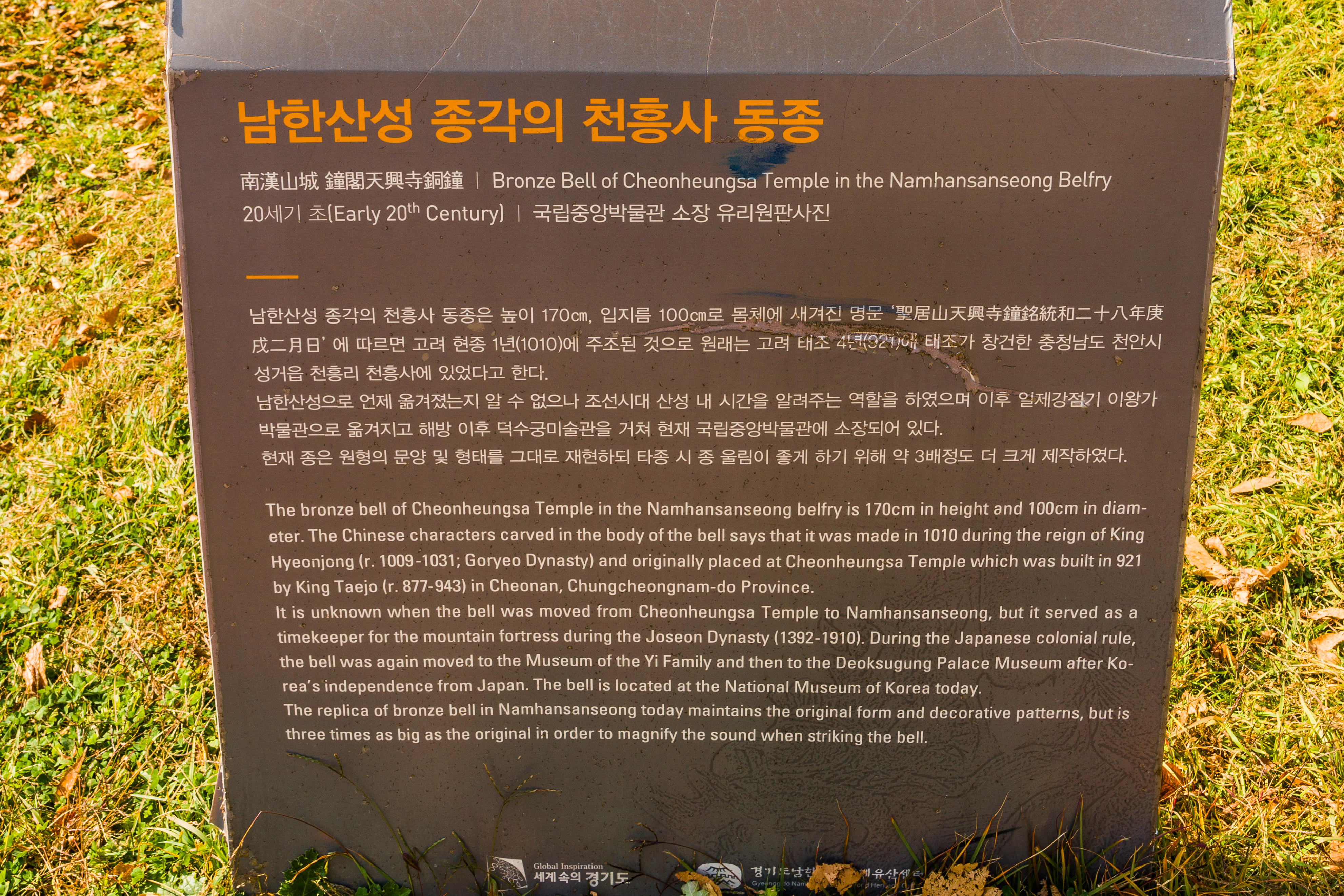 남한산성행궁으로 가다보면 종각의 천흥사 동종이 있습니다. ↓아래설명↓조선시대 산성 내 시간을 알려주는 역할을 하였다고 하네요 ~ 시계종이네요 !