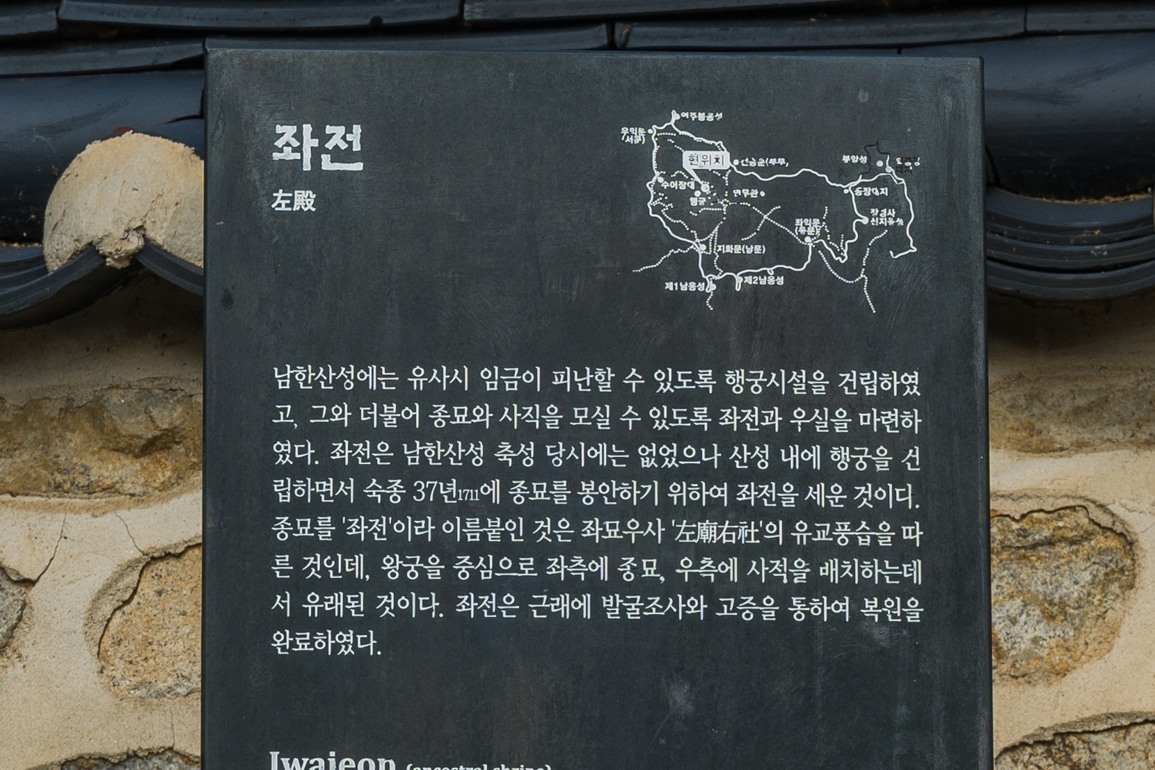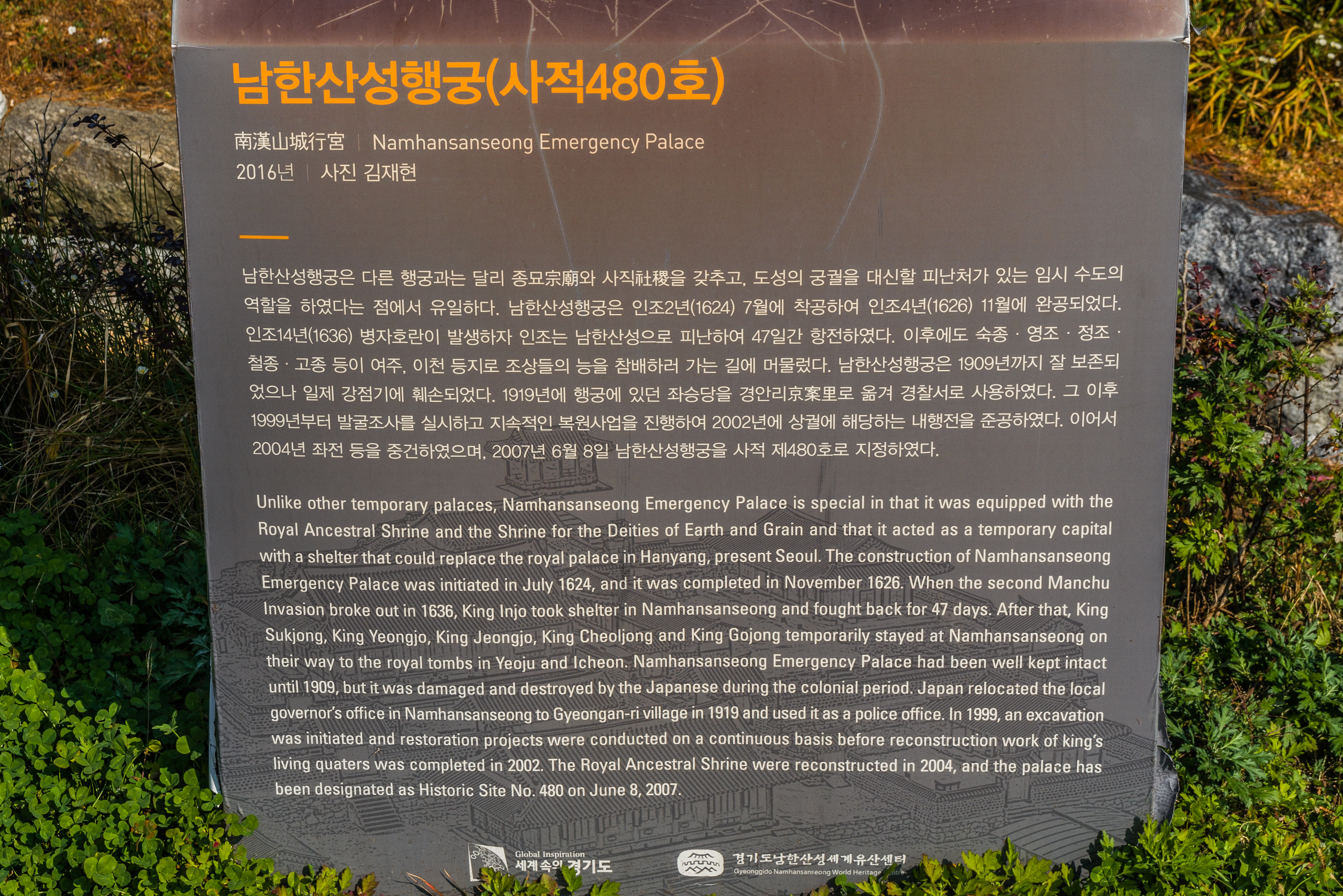 남한산성행궁(사적480호) 임금이 서울의 궁궐을 떠나 도성 밖으로 행차하는 경우 임시로 거처하는 곳을 행궁이라 한다. 남한산성 행궁은 전쟁이나 내란 등 유사시 후방의 지원군이 도착할 때까지 한양 도성의 궁궐을 대신할 피난처로 사용하기 위하여 조선 인조 4년(1626)에 건립되었다. 실제로 인조 14년(1636) 병자호란이 발생하자 인조는 남한산성으로 피난하여 47일간 항전하였다. 이후에도 숙종, 영조, 정조, 철종, 고종 등이 여주, 이천 등의 능행길에 머물러 이용하였다. 남한산성 행궁은 1909년까지 잘 남아 있었으나 일제강점기에 일본에 의해 훼손되었다. 1999년부터 발굴 조사를 시작하여 2002년에 상궐에 해당하는 내행전을 준공하고 2004년 행궁 좌전을 준공하였다.